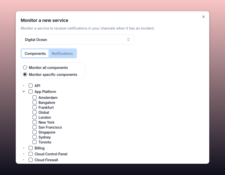 In the example above, if you choose "App Platform" -> Amsterdam, London, and New York, you will receive alerts only when there is an outage in Amsterdam, London, or New York for App Platform.